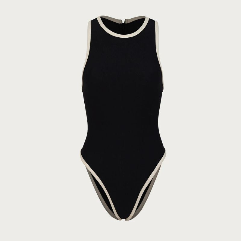 Die Terilynn ist die perfekte Kombination aus sportlich und elegant. Der Badpak hat ein minimalistisches Design mit einer großen, geschliffenen Haut und kontrastierenden, witzigen Mustern. Der hochgeschnittene Ausschnitt akzentuiert die Figur und sorgt für einen stilsicheren, flachen Auftritt.